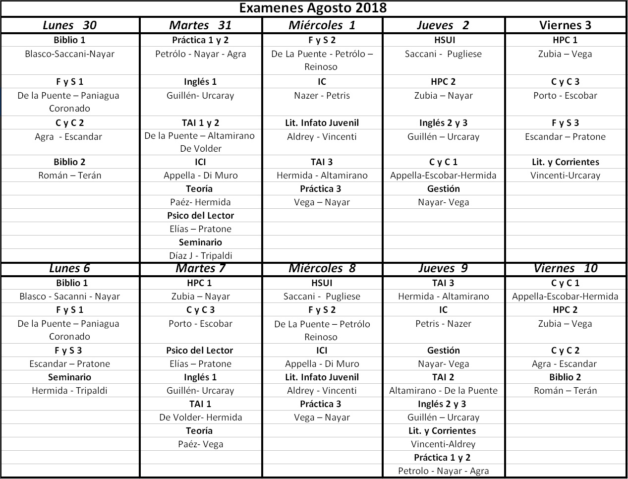 2dos llamados – del 6 de Agosto al 10 de Agosto.