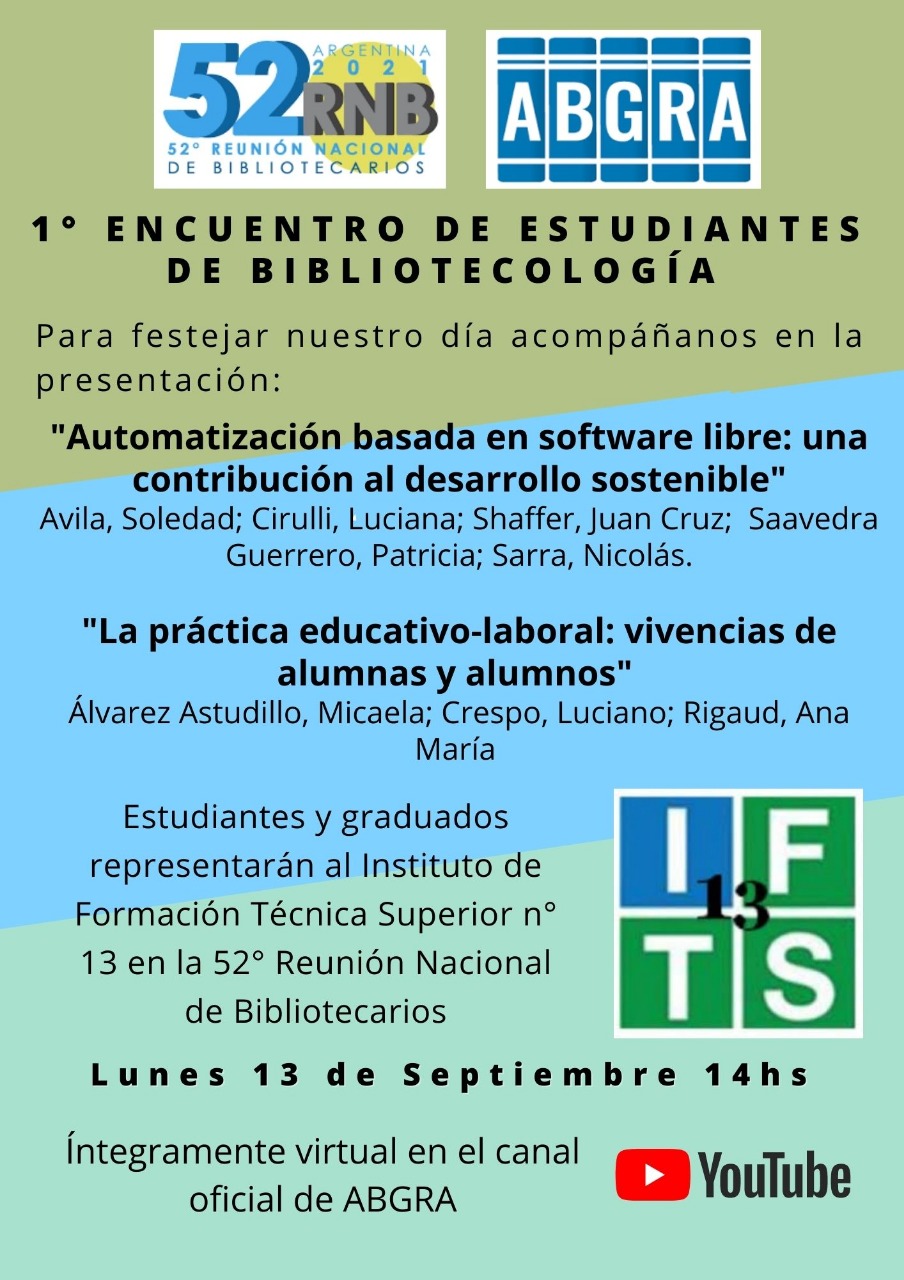 Les recordamos que el día de mañana se realizará el 1º Encuentro de estudiantes de bibliotecología en el marco del 52º Reunión Nacional de Bibliotecarios de ABGRA.