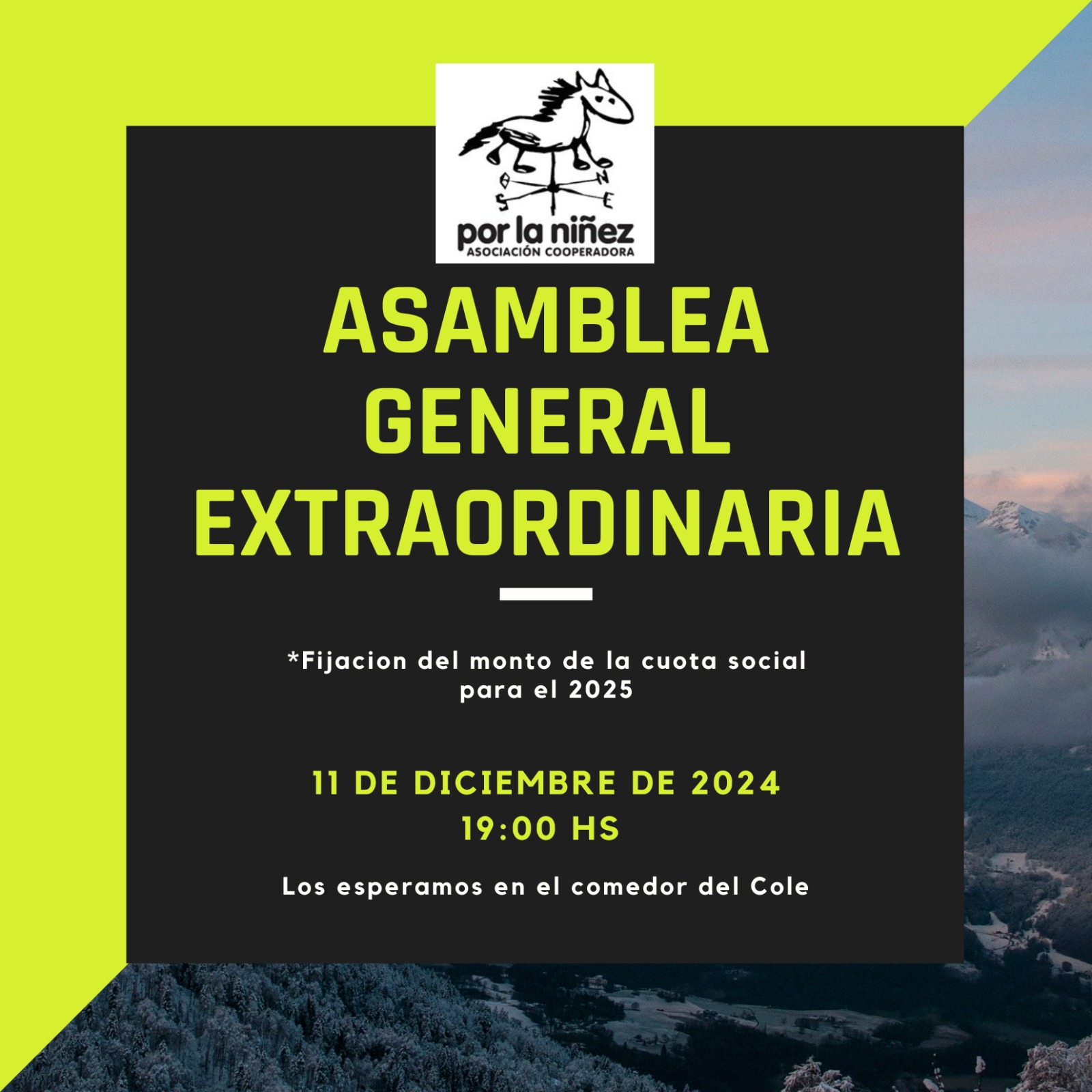 Hoy, martes 11 diciembre, a las 19:00 h en el Comedor de la Escuela Primaria, se realizará la Asamblea General Extraordinaria de nuestra Asociación Cooperadora «Por la Niñez», en la que se acordará el monto de la cuota social para el próximo año.