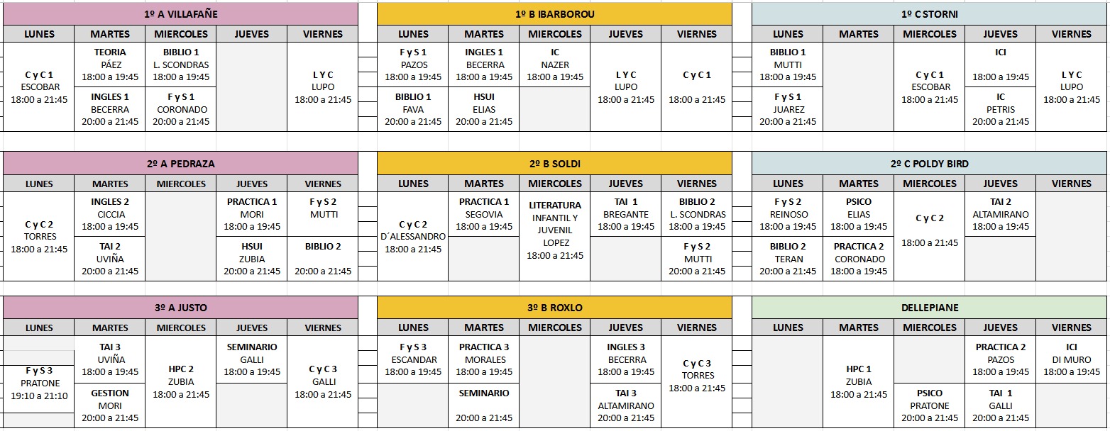 Compartimos con ustedes la grilla horaria para el próximo cuatrimestre. Pueden revisar los horarios en su totalidad, pero tengan en cuenta que estos están sujetos a posibles modificaciones debido a que algunos docentes han renunciado o se han jubilado.