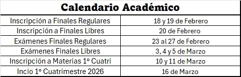 Les compartimos fechas de inscripciones a mesas de exámenes (regulares y libres), inscripciones a materias del 1.° cuatrimestre [no ingresantes] e inicio del ciclo lectivo 2026: