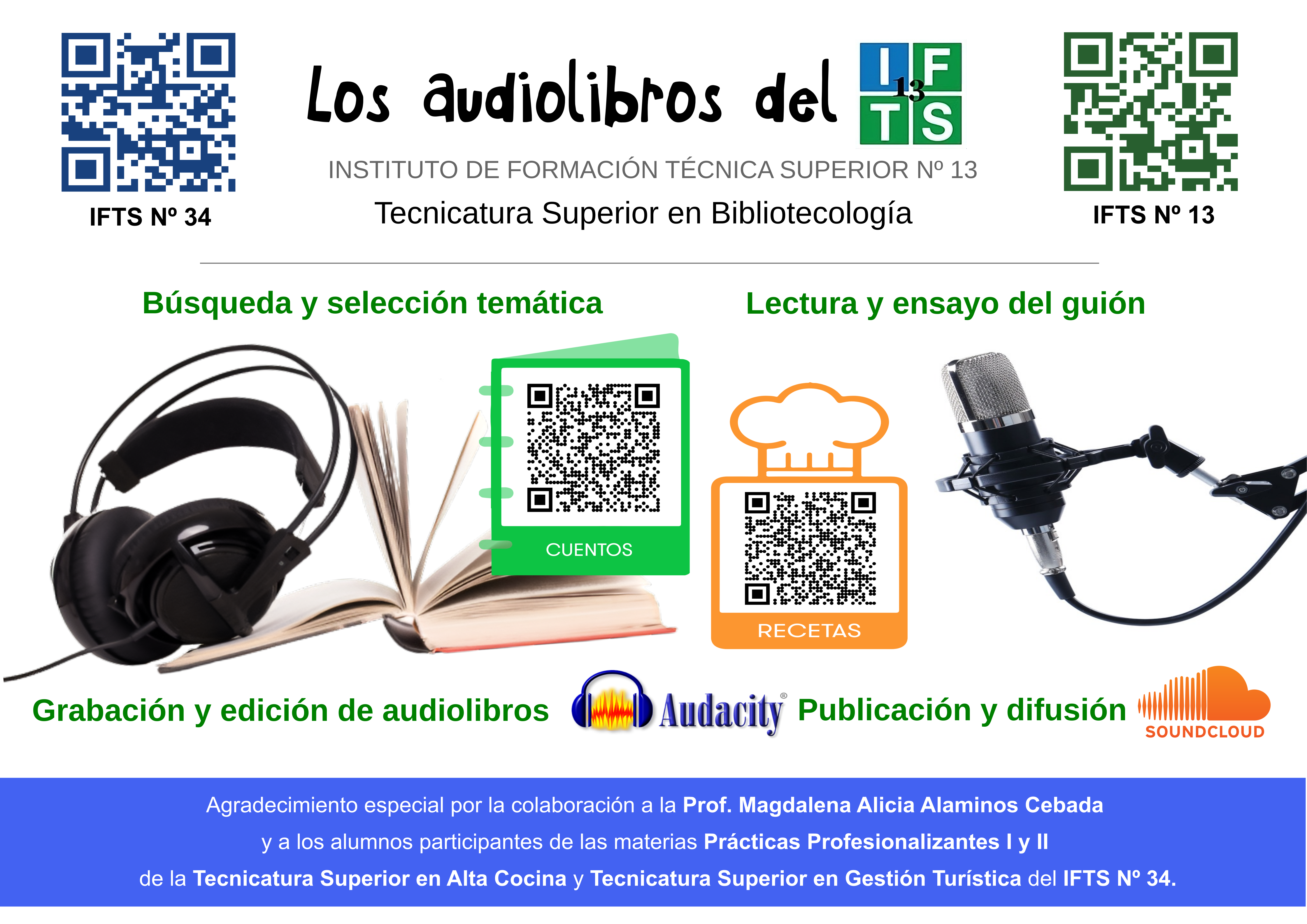 Agradecemos a nuestra comunidad: directivos, docentes y estudiantes, con especial mención a Pablo Larumbe por su compromiso cotidiano con el proyecto. Paralelamente, agradecemos a los estudiantes: Víctor Fernández, María del Carmen Arancibia, Emiliana Ibáñez, Miriam Salas, Fernando Ruiz Diaz y Vanesa Herrera de la materia Prácticas Profesionalizantes 1 de la profesora Magdalena Alicia Alaminos Cebada, de la Tecnicatura Superior en Alta Cocina del Instituto de Formación Técnica Superior N,° 34, por participar con audiolibros de recetas regionales en varios idiomas.